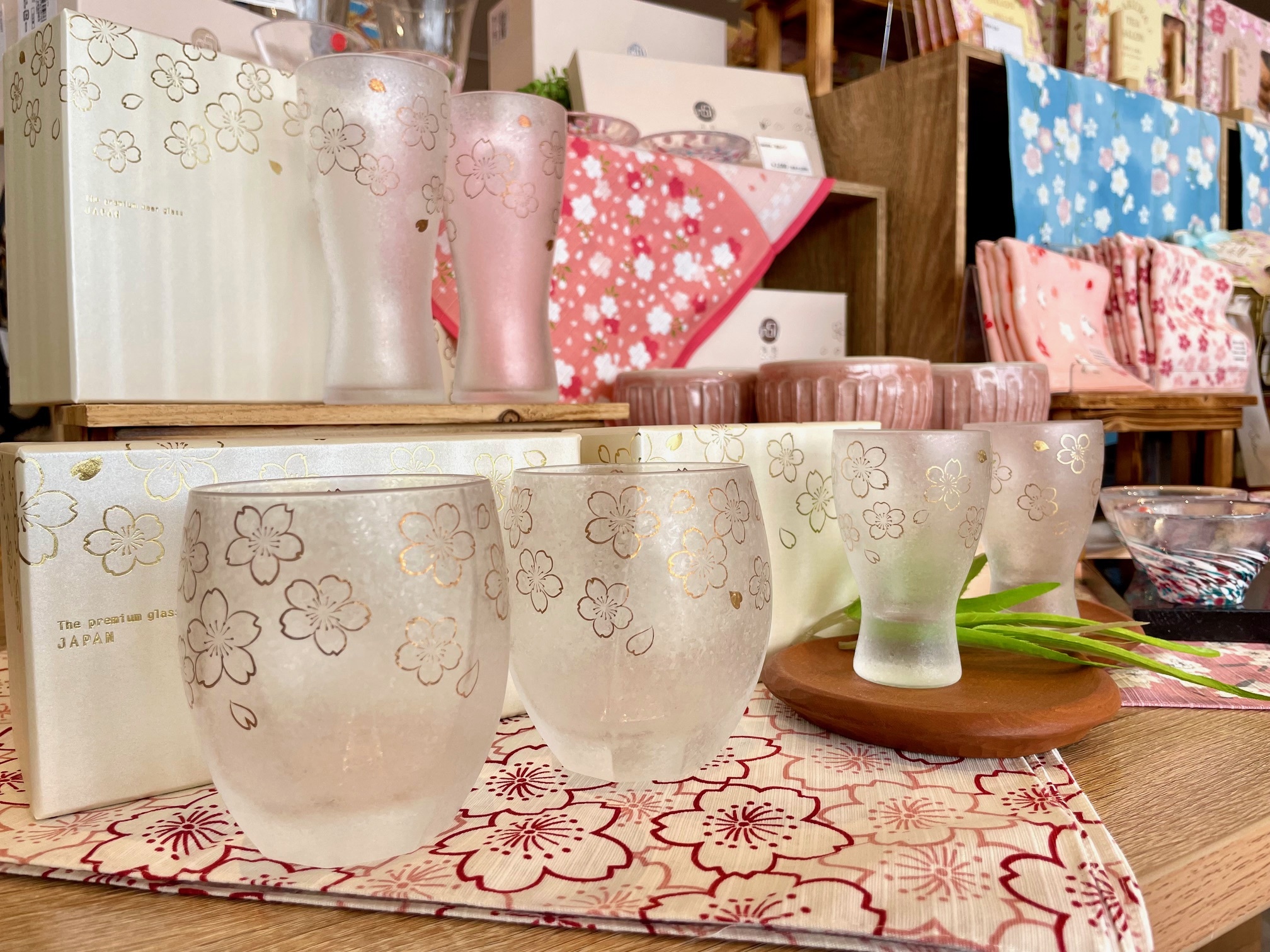 毎年人気の桜柄のペアグラス。¥3,850~¥4,400(税込み)